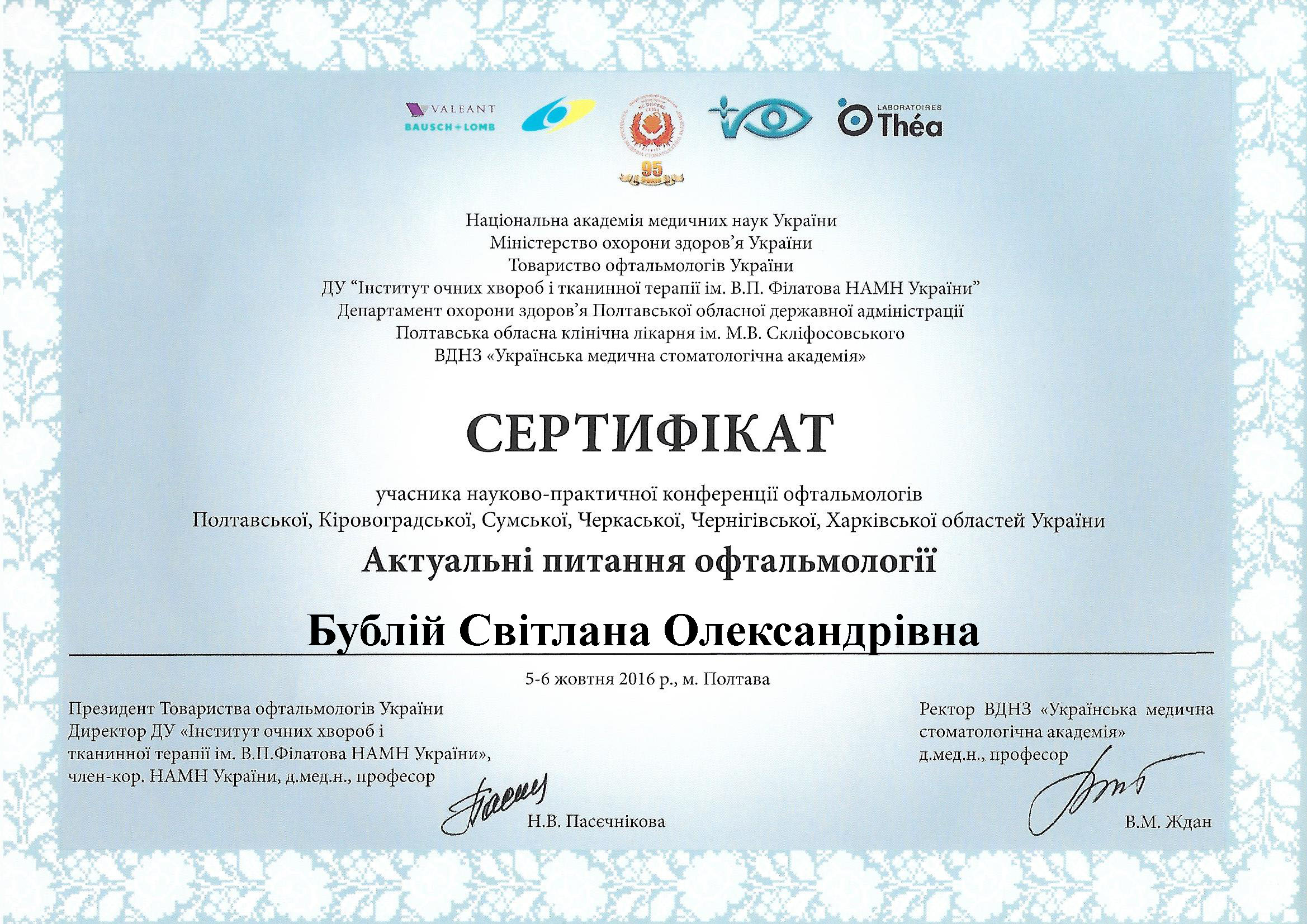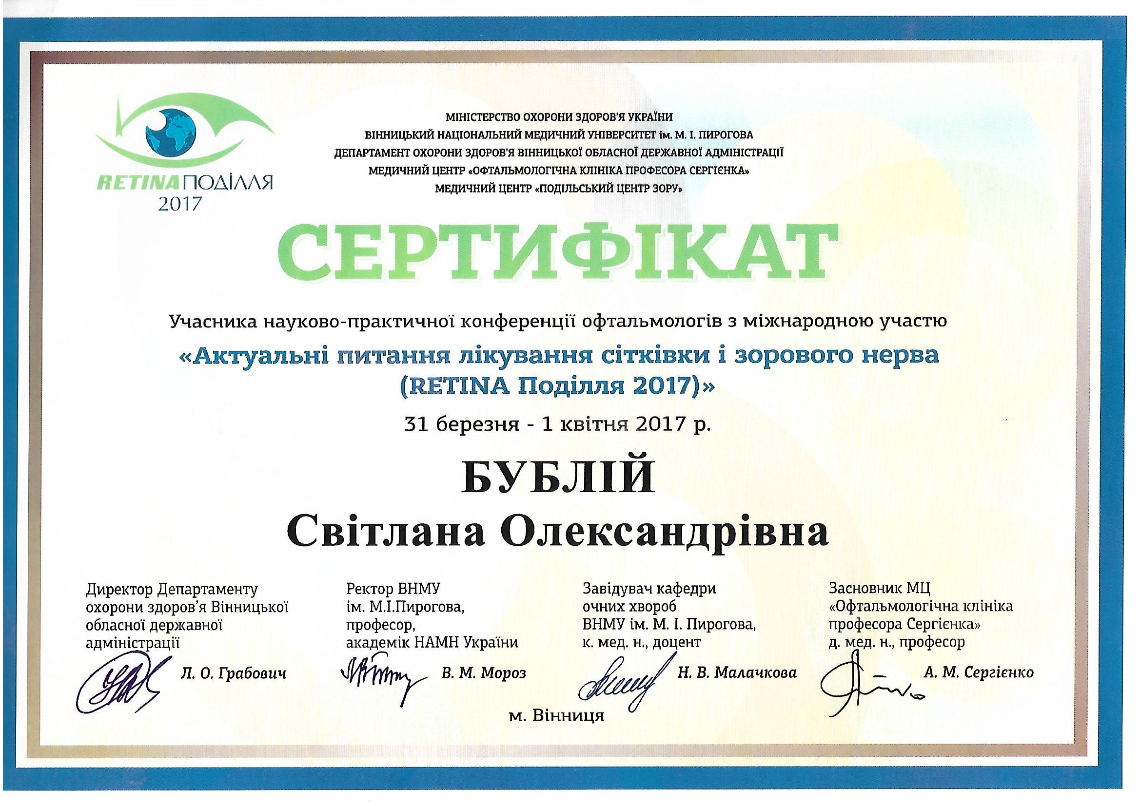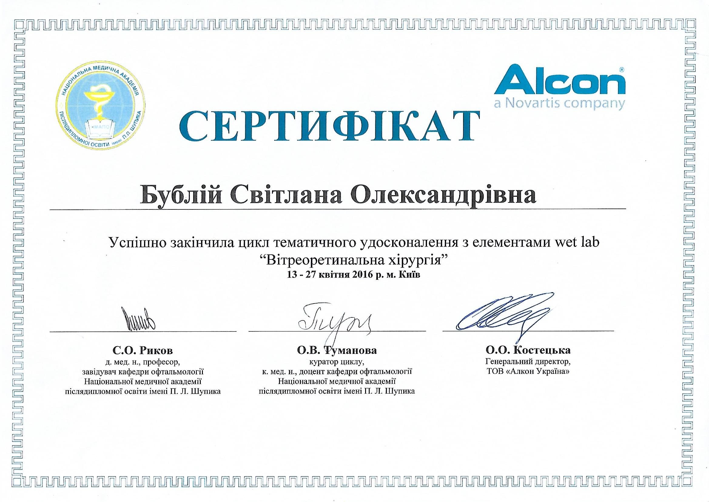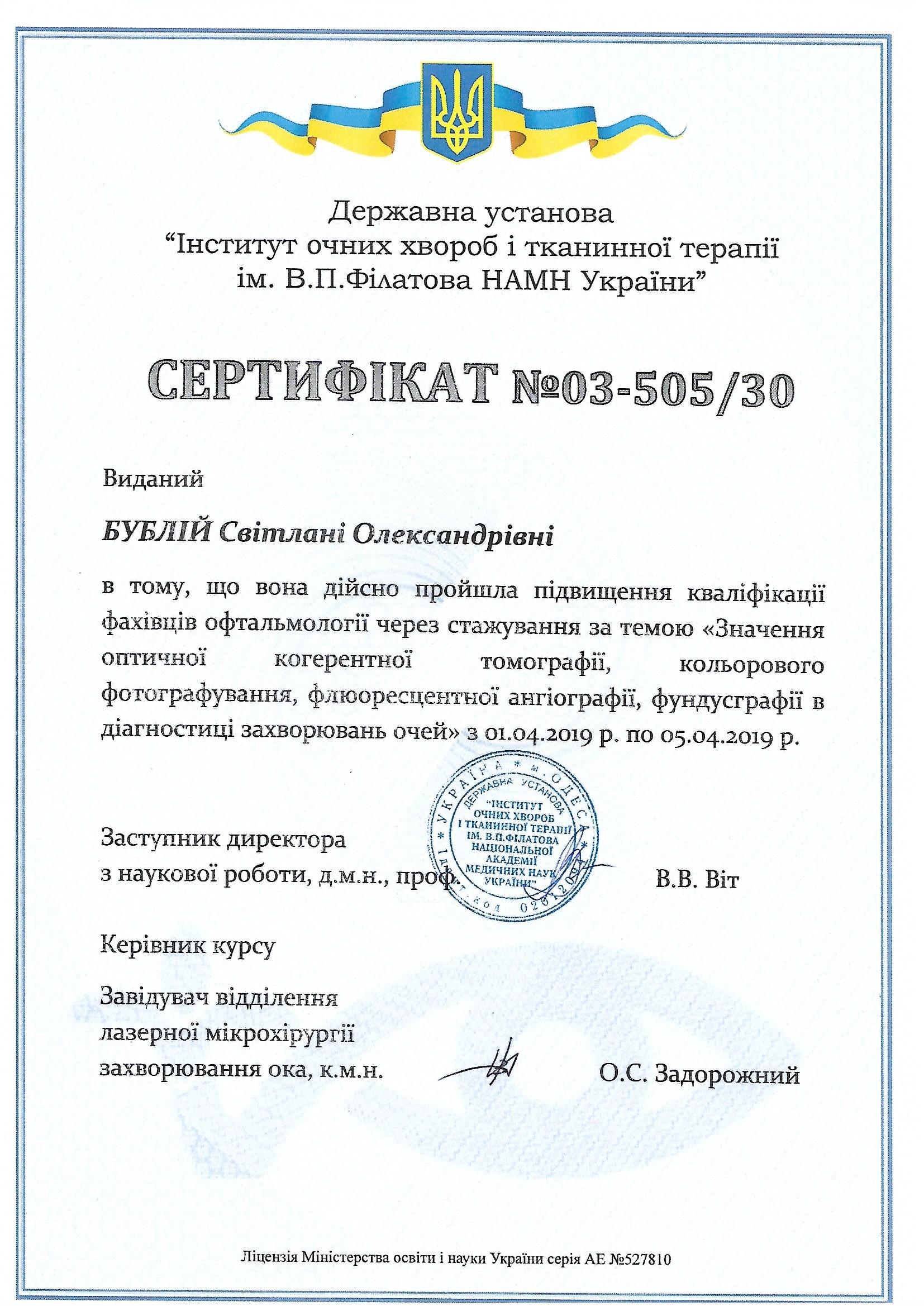2003-2005 рр. – Інтернатура за спеціальністю Офтальмологія у Національній медичній академії післядипломної освіти імені П. Л. Шупика, Київ та Черкаської обласної лікарні;