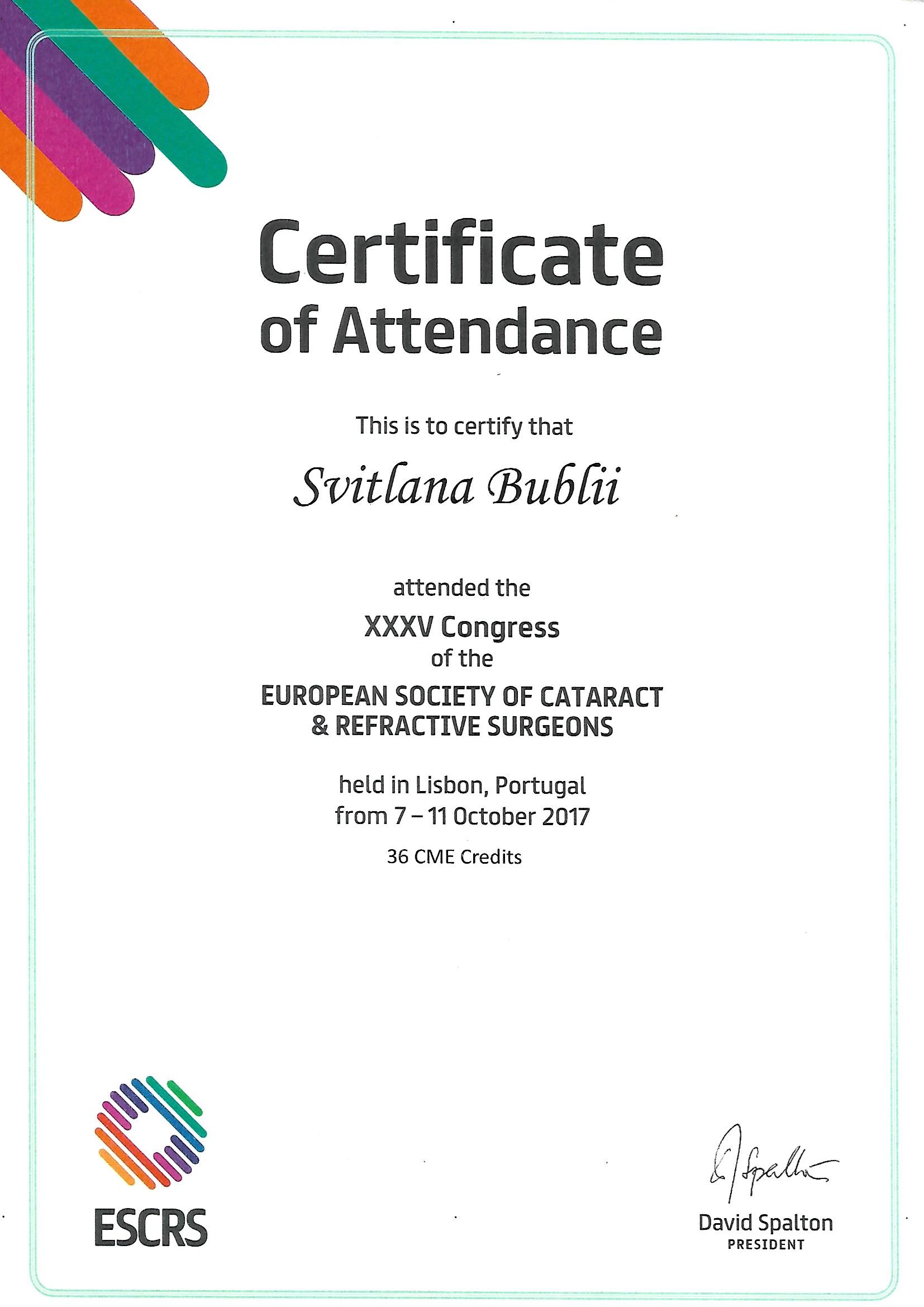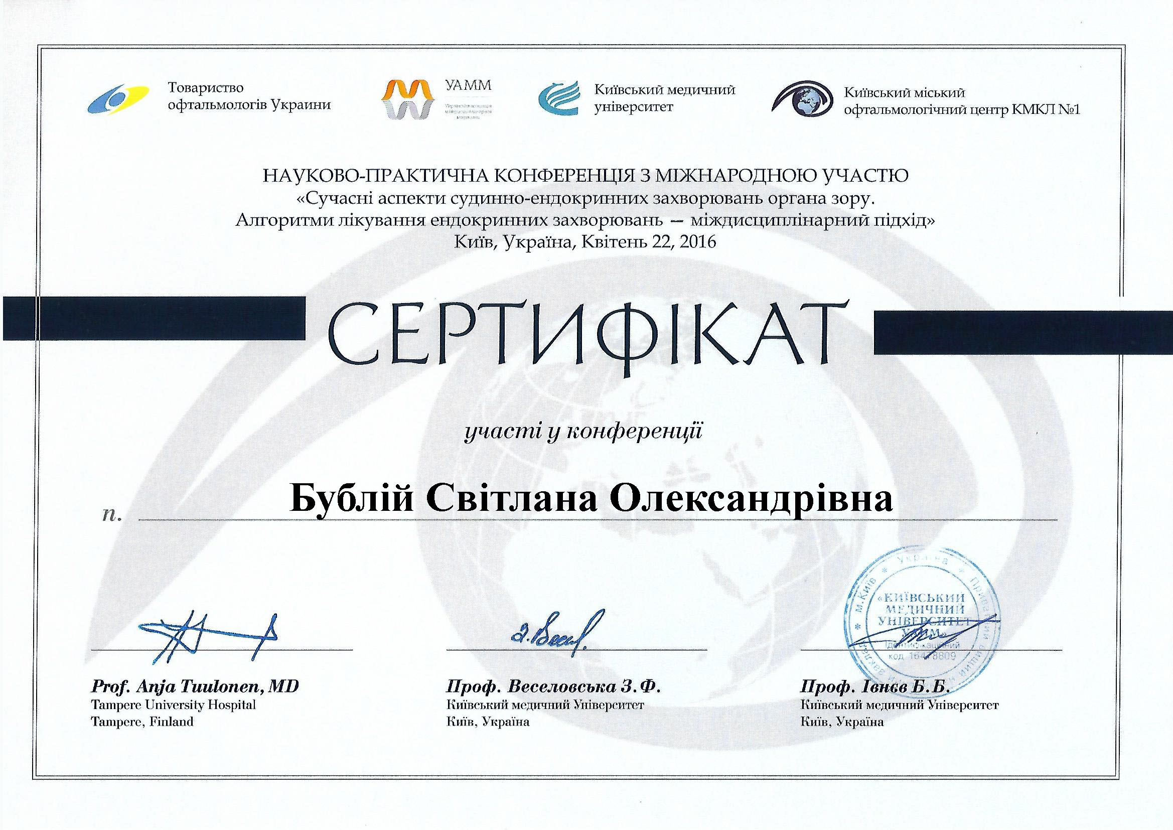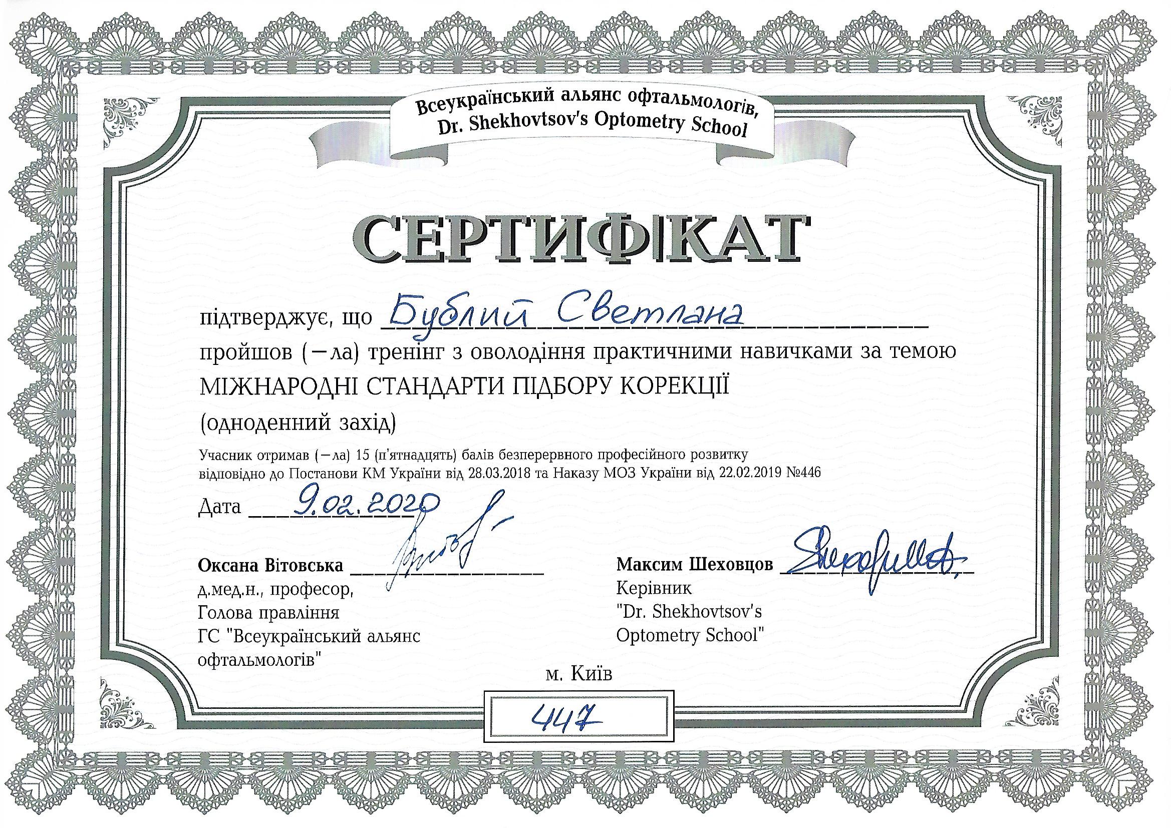 2003-2005 рр. – Інтернатура за спеціальністю Офтальмологія у Національній медичній академії післядипломної освіти імені П. Л. Шупика, Київ та Черкаської обласної лікарні;