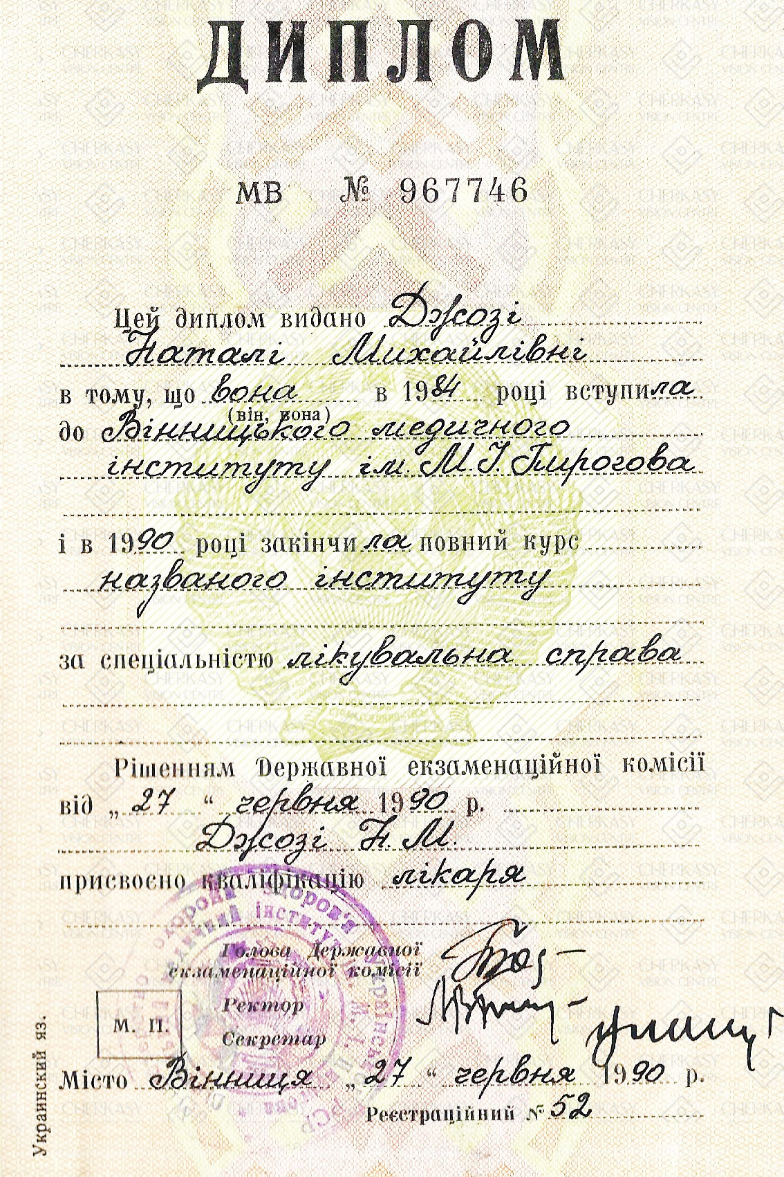 - 10 років на посаді завідувачки офтальмологічним відділенням Черкаської обласної лікарні та головного офтальмолога Черкаської області;