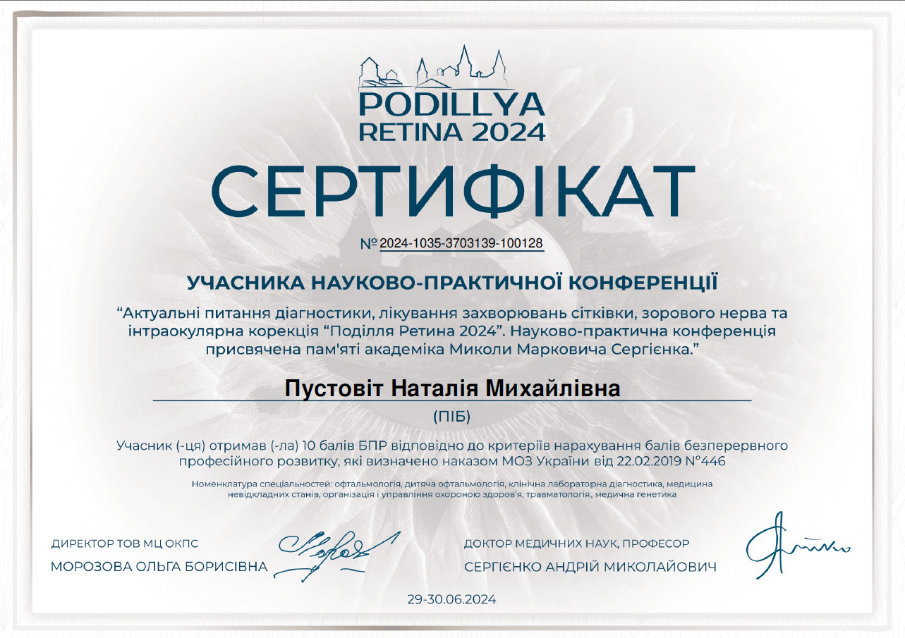Наталія Михайлівна – провідний спеціаліст Черкаського центру зору з колосальним досвідом в офтальмологічній практиці. Спеціалізується на лікуванні катаракти, глаукоми, їх ускладнень та менеджменті складних випадків.